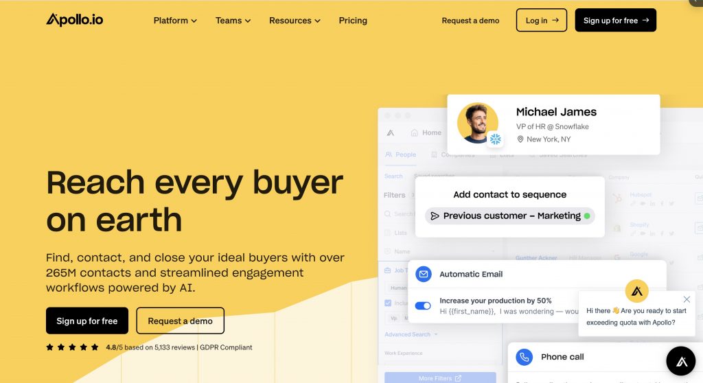 - Strategic Account-Centric Marketing: Apollo facilitates the targeting of specific accounts through lead intelligence-driven identification, followed by personalized engagement via the platform's sales interaction features.